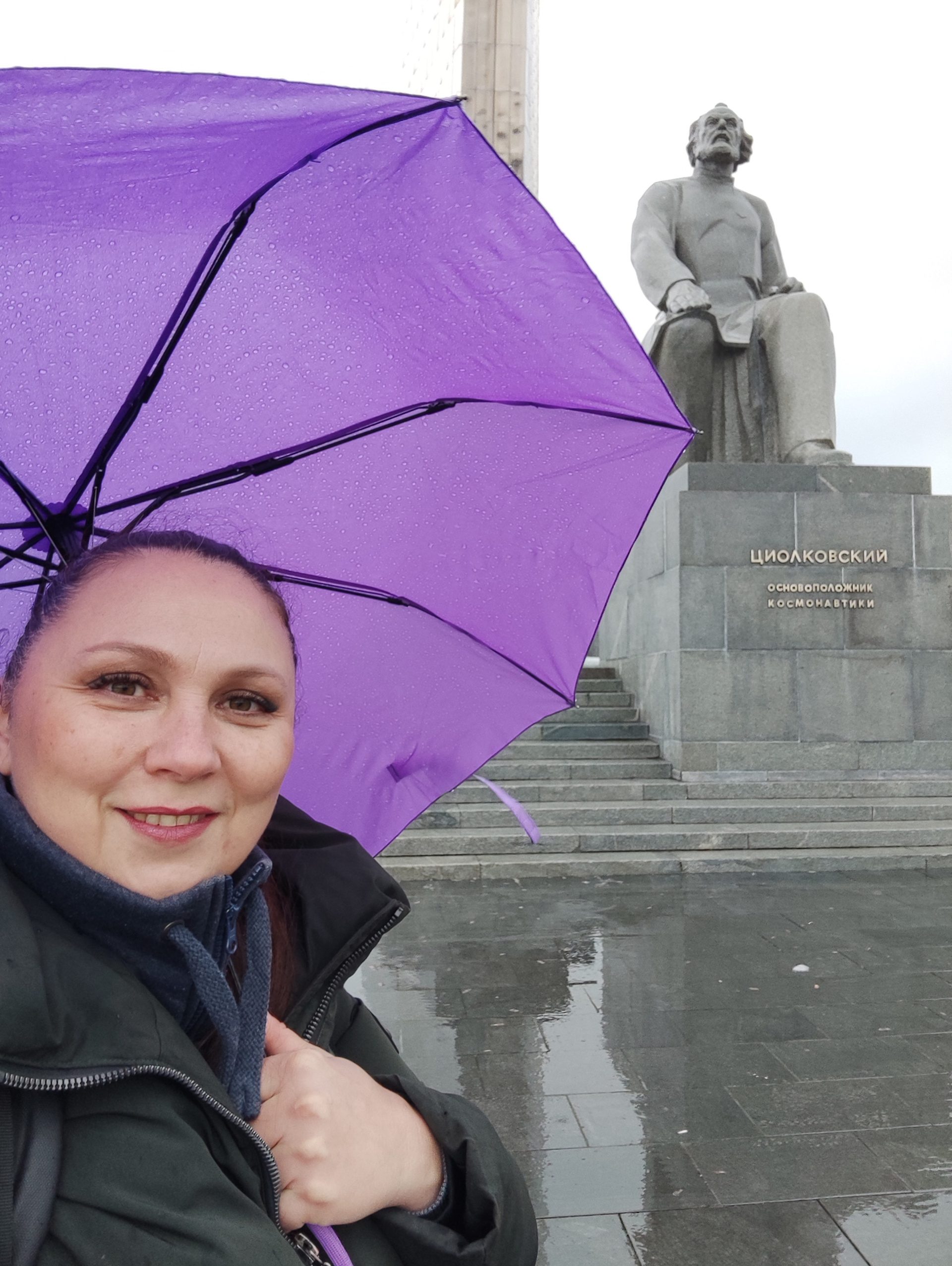 Памятник Циолковскому. Все таки когда-то я работала на заводе местном АО ИСС имени М. Ф. Решетнева, наш завод выпускает космические спутники — и тема космоса мне близка и можно сказать я тоже приложила свою руку к освоению космоса, отдав работе на заводе больше 17 лет. Зонтик пришлось купить в Москве, совершенно невозможно было гулять под таким дождем. Снег кстати на фото видно, он в стадии льда у ступенек.