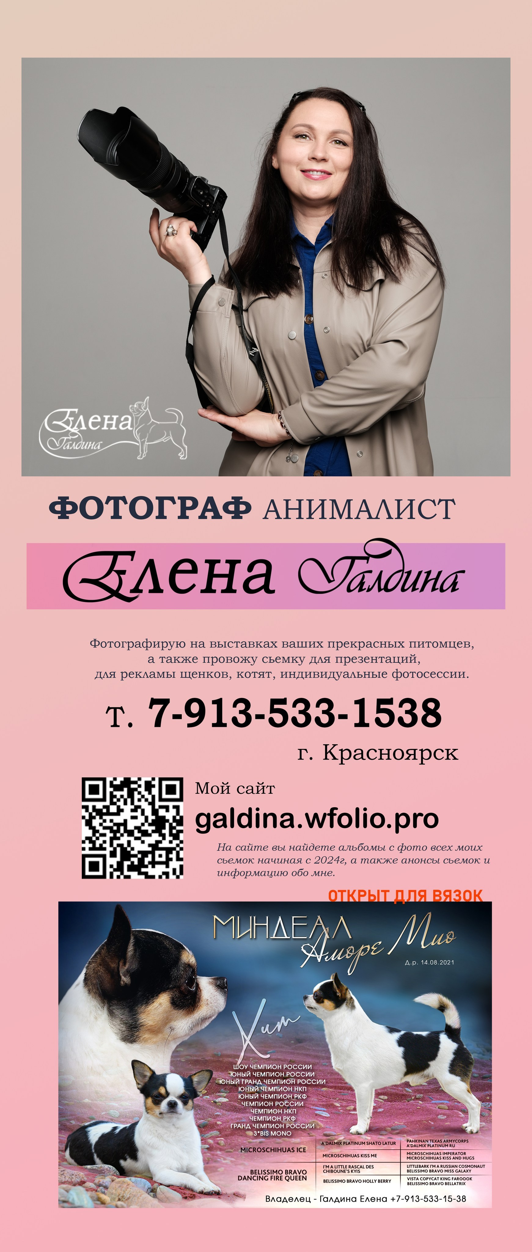 Давайте знакомиться. Я фотограф анималист из Сибири из маленького городка Железногорск, Красноярского края. Работаю в основном на выставках собак и кошек в г. Красноярск, а также бываю на выставках собак в гг. Иркутск, Ангарск, Абакан, Ханты-Мансийск, Новосибирск и пр. Моя главная любовь и страсть — репортажная съемка, когда нужно успеть поймать лучший ракурс, увидеть и предугадать поведение собаки в ринге и остановить самое лучшее мгновение своей камерой! Считаю, что это самая лучшая работа в мире — ловить мгновения, эмоции, запечатлевать атмосферу выставки и записывать историю побед с помощью фото. А также я снимаю выставки кошек, провожу индивидуальные сьемки собак и кошек, и конечно их замечательных владельцев. Всегда открыта к сотрудничеству, принимаю приглашения на выезд для съемки в разные города. Вы можете оставить заявку на фотосьемку на выставке или на индивидуальный фотосет по телефону +7-913-533-1538